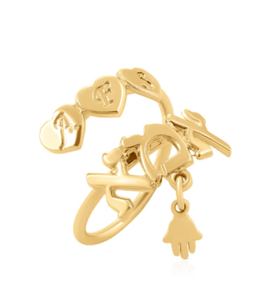 טבעת אמא עם שמות ילדים חרוטים על גבי לבבות וחמסה תלויה. ניתן לקבל בכל המידות, עד 3 לבבות. אפשרי גם בכסף 925