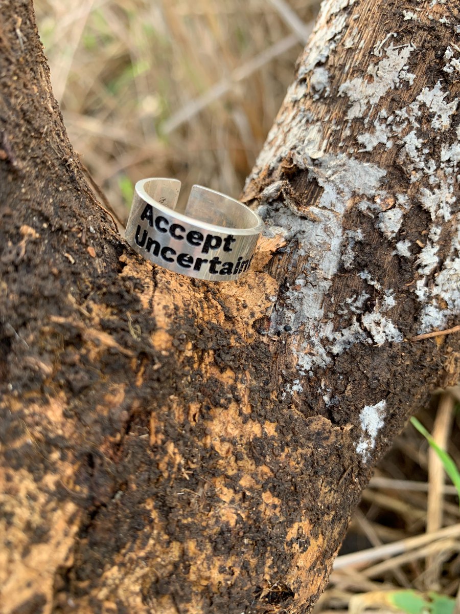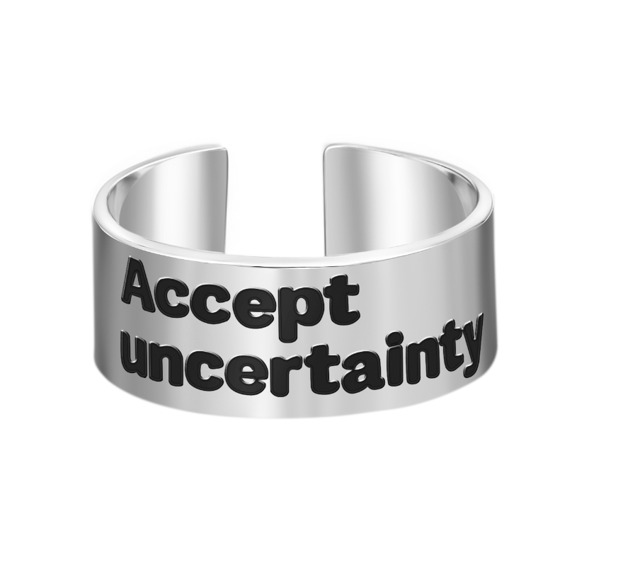 טבעת עבה, פתוחה, מתאימה לכל מידה, שמזכירה לנו את אי הוודאות בכל רגע ורגע, אם נדע לזכור, להבין ולהרגיש את זה, נחייה חיים מלאים ושלווים יותר.