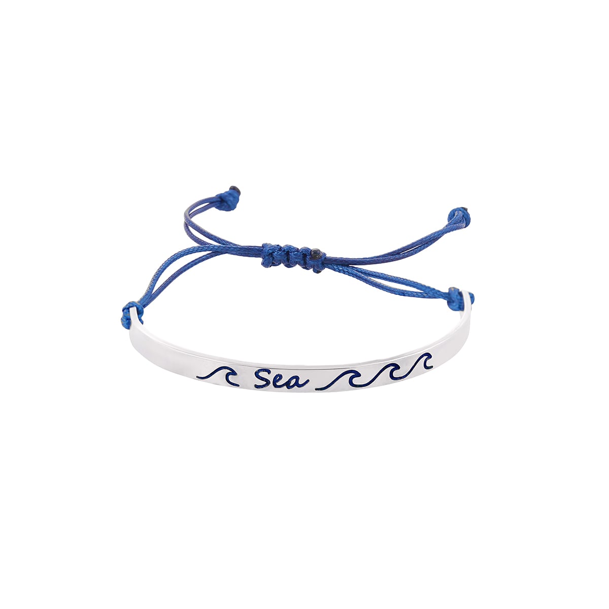 צמיד כסף מחובר לים ולחופש עם עיטור של גל בצבע כחול, נסגר בעזרת חוט שעווה עם סגירת מקרמה