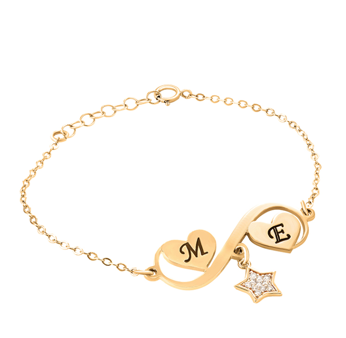 צמיד לבבות המאחד אותכם יחד, ניתן לרשום אותיות של שמכם, אלגנטי מוזהב עם כוכב משובץ תלוי. ניתן לקבל גם בכסף אמיתי 925