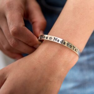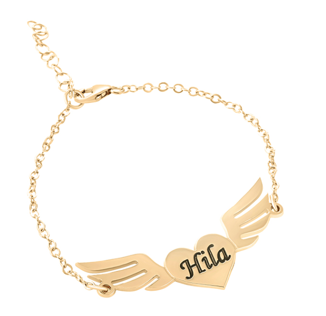 צמיד לב עם כנפיים מחוברות, חריטה עמוקה מושחרת של השם הנבחר. אלגנטי, עדין ומוזהב.
