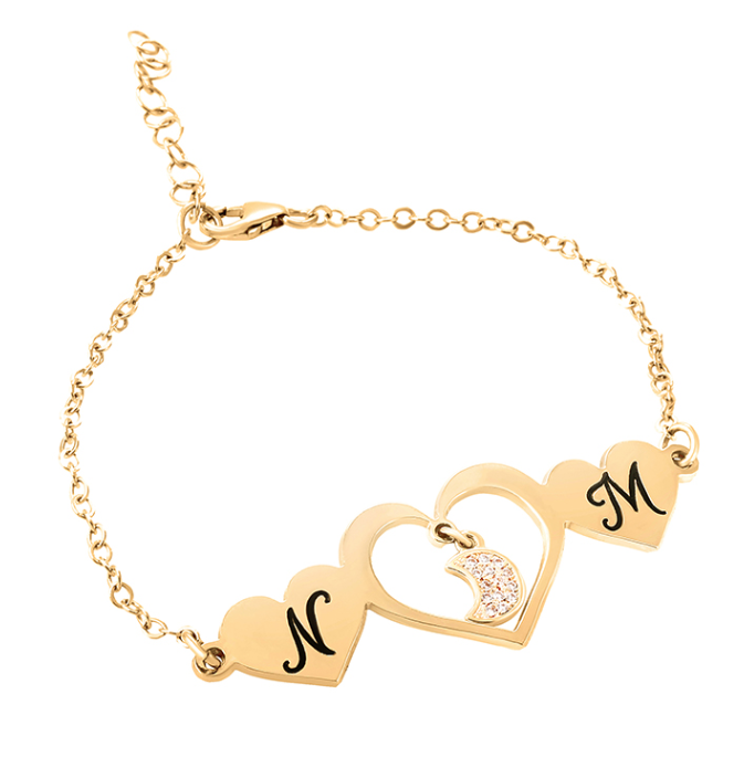 צמיד שלוש לבבות מחובר המאחד אותכם יחד, ניתן לרשום אותיות של שמכם, אלגנטי מוזהב עם ירח משובץ תלוי.