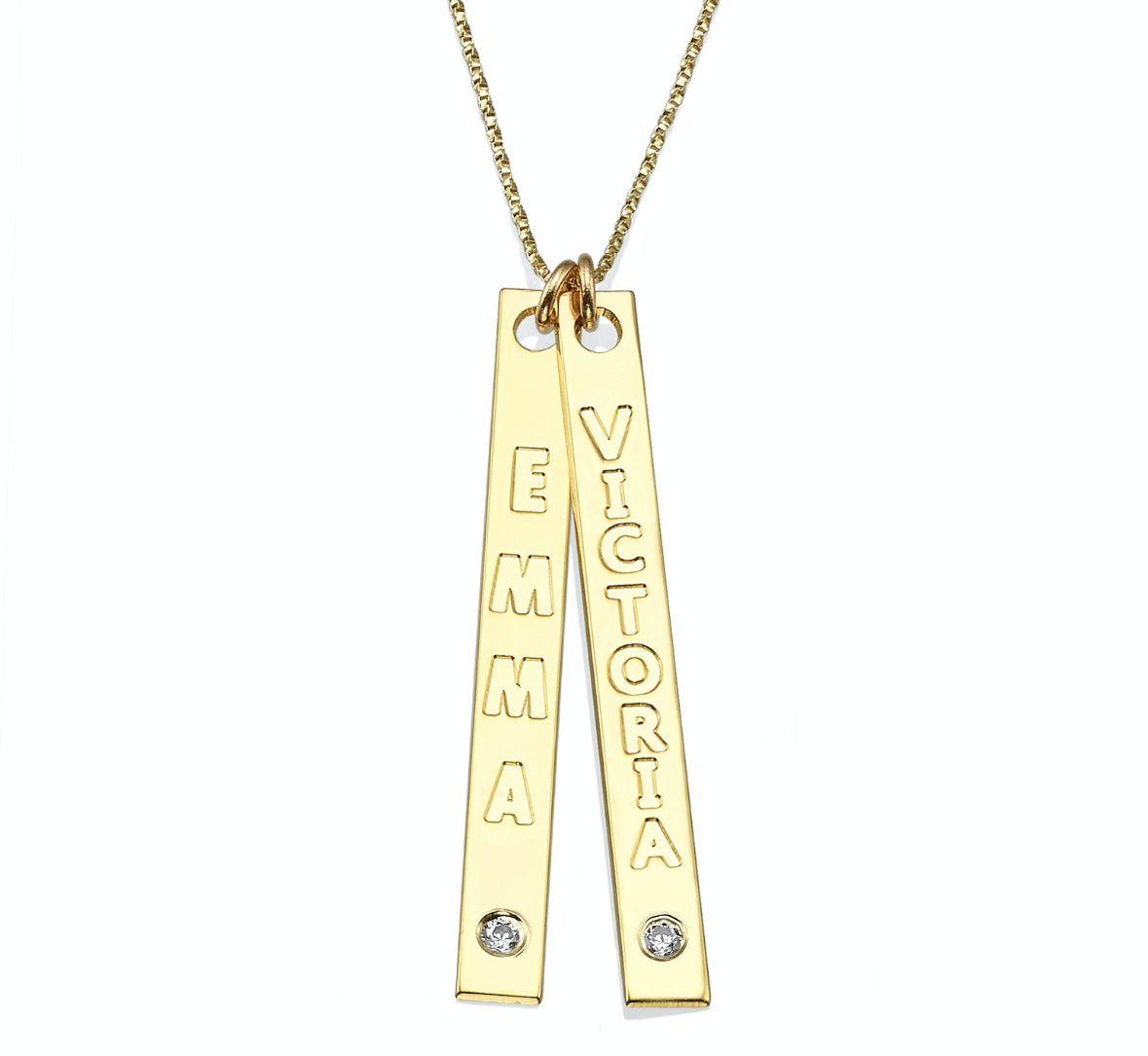 שרשרת זהב 14K עם שני מלבנים לאורך עם שני שמות בתוספת שני יהלומים
