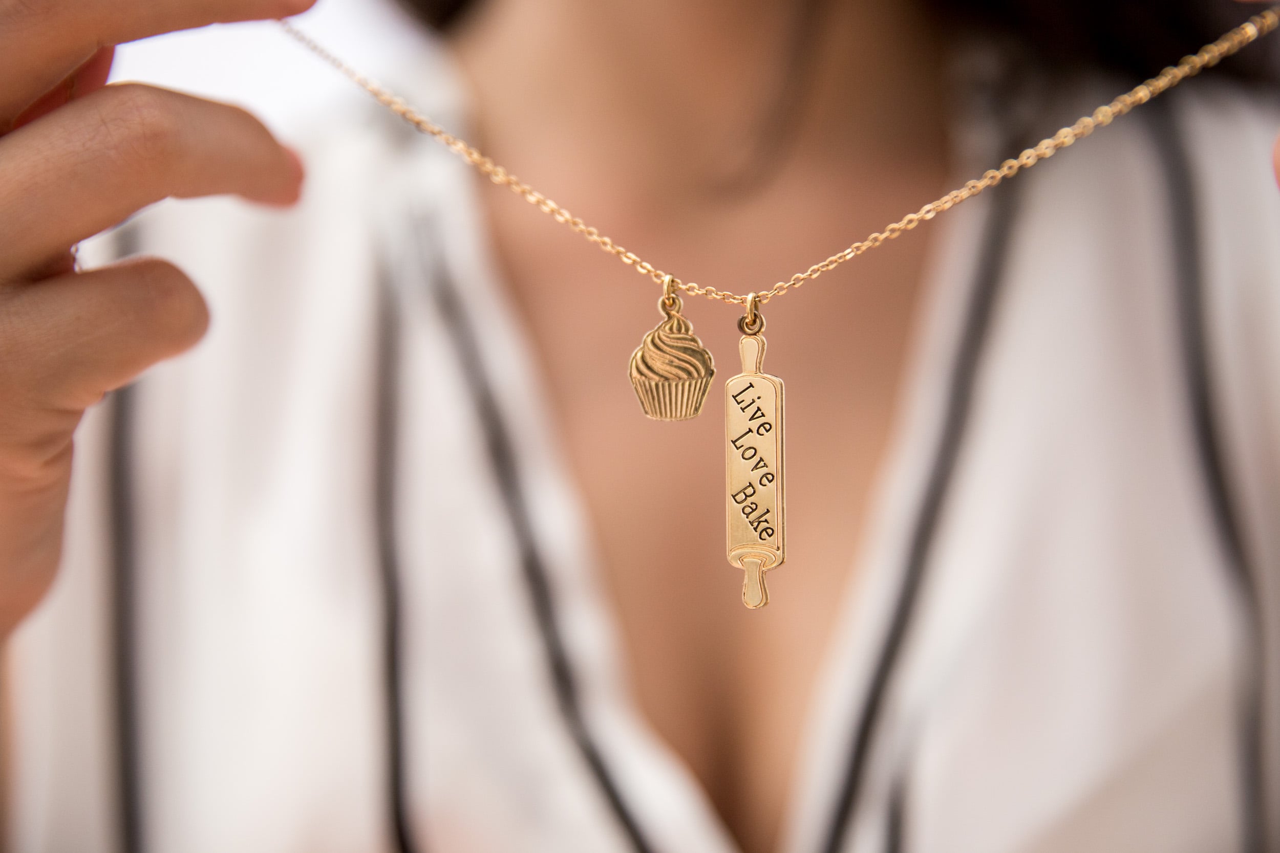 לכל חובבות האפייה או לשפיות המיוחדות, שרשרת בייקרי, המתנה המושלמת לפנק מישהי שאוהבים. ניתן לחרוט בעיצוב אישי בצד האחורי הדגשה מיוחדת. התליון משולב עם שרשרת לולאות עדינה בציפוי 14K בציפוי 2 מיקרון. ניתן להזמין את השרשרת גם בכסף 925.