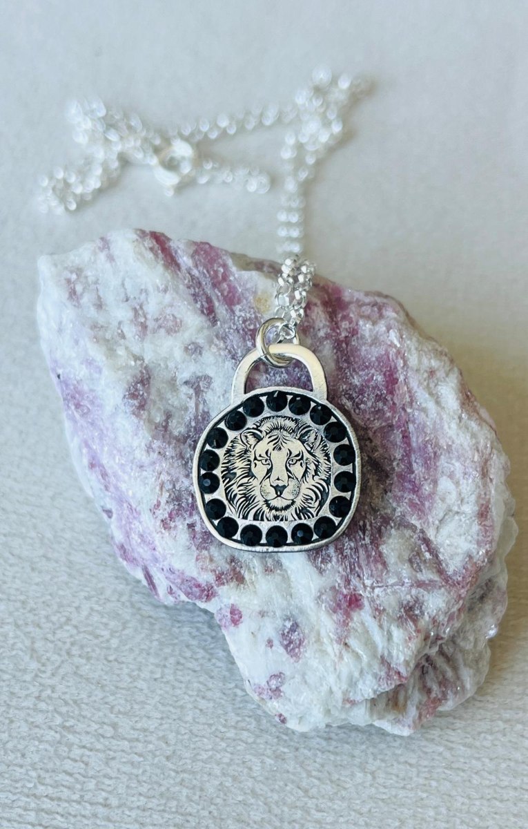 במרכז התליון – חריטה עדינה של אריה, סמל לעוצמה פנימית, אומץ ושקט בטוח בעצמו.