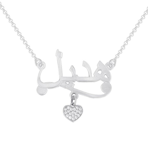 השם שלכם חרוט בכתב ערבי זורם ויפהפה, ולצידו פס עדין ולב משובץ אבנים שמוסיף נופך של זוהר וקסם. השרשרת נראית מעודנת אך מרשימה, והיא מתאימה לכל סגנון לבוש – מסגנון יומיומי ועד לערב חגיגי.
